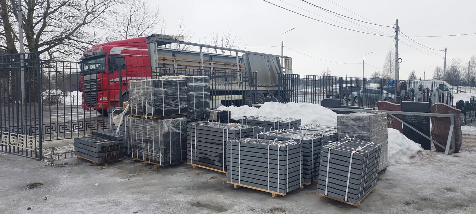 Сырье получено, мы его уже разгрузили манипулятором. Камень упакован на поддоны по 20 штук. Тумбы и цветники также упакованы, готовы к отправке. Принимаются заказы на гранит Карелия фурой доставка по вашему адресу в любую точку. Также доступны гранит опт памятники – плиты, заготовки и готовые надгробия.